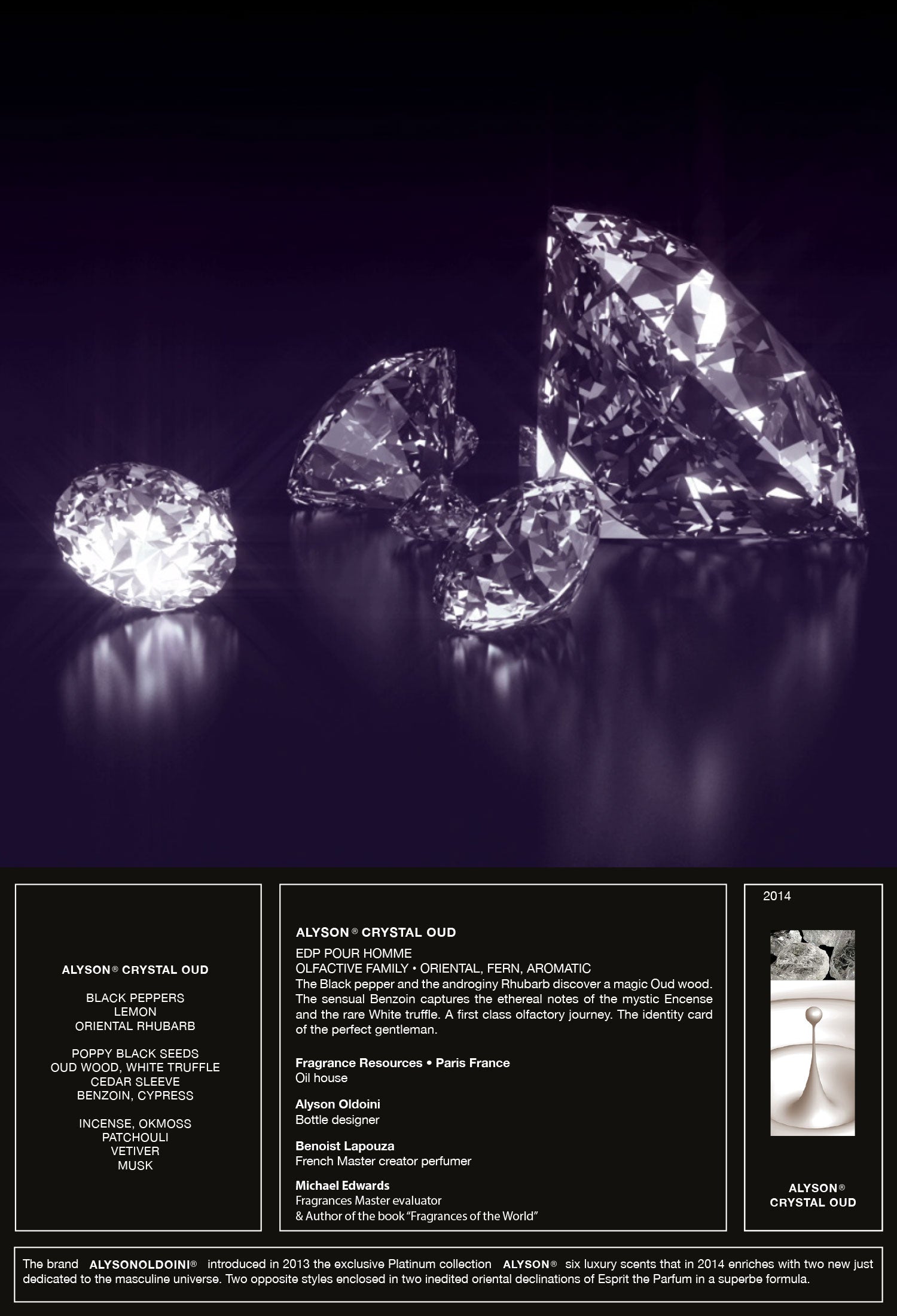 The black pepper and the androgyny rhubarb discover a magic oud wood. The sensual benzoine captures the ethereal notes in the mystic encense and the rare white truffle. A first class olfactory journey. The identity card of the perfect gentleman.