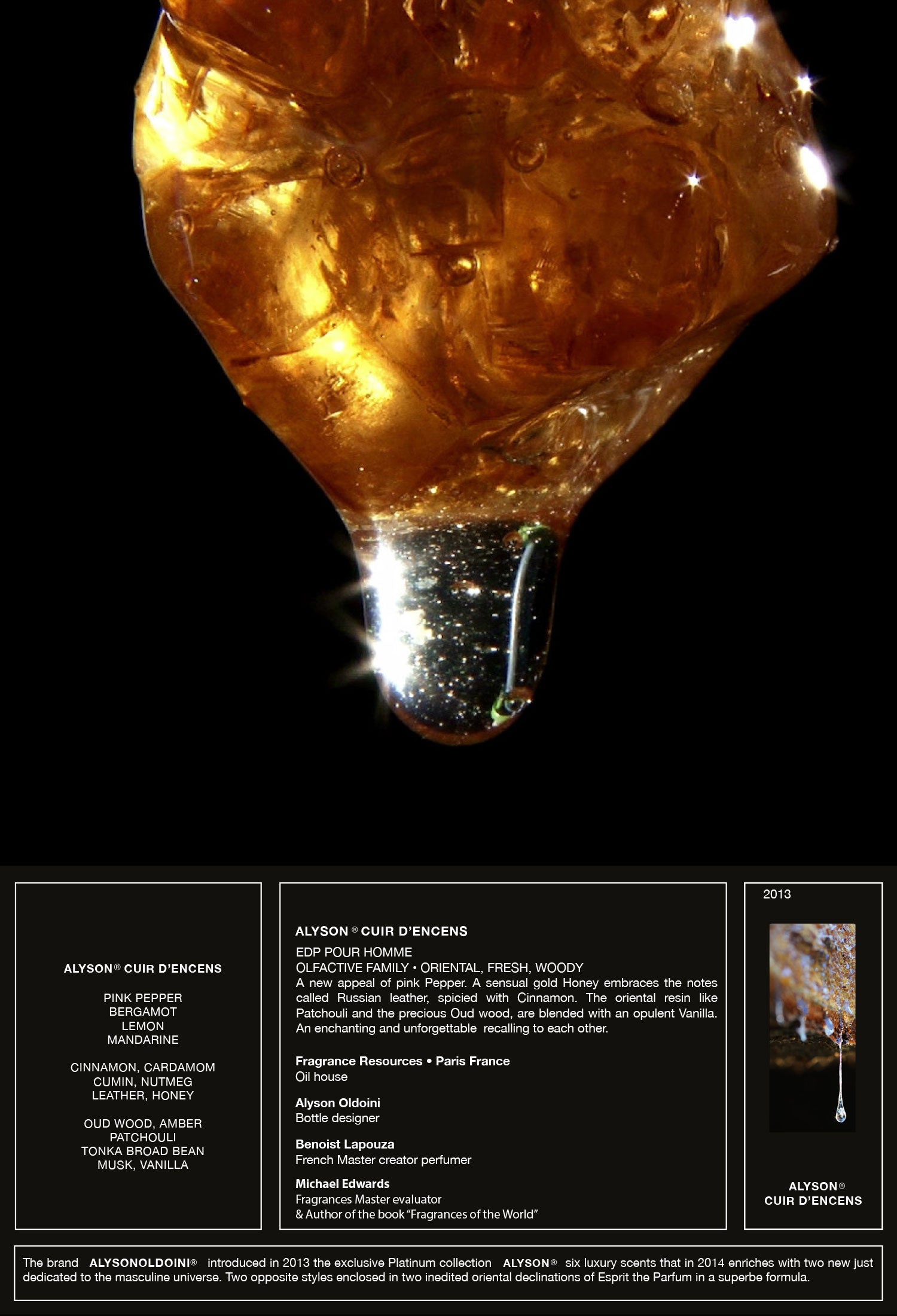 Pink Pepper, Bergamot, Lemon, Mandarine, Cinnamon, Cardamom, Cumin, Nutmeg, Leather, Honey, Oud Wood, Amber, Patchouli, Tonka Broad Bean, Musk, Vanilla.